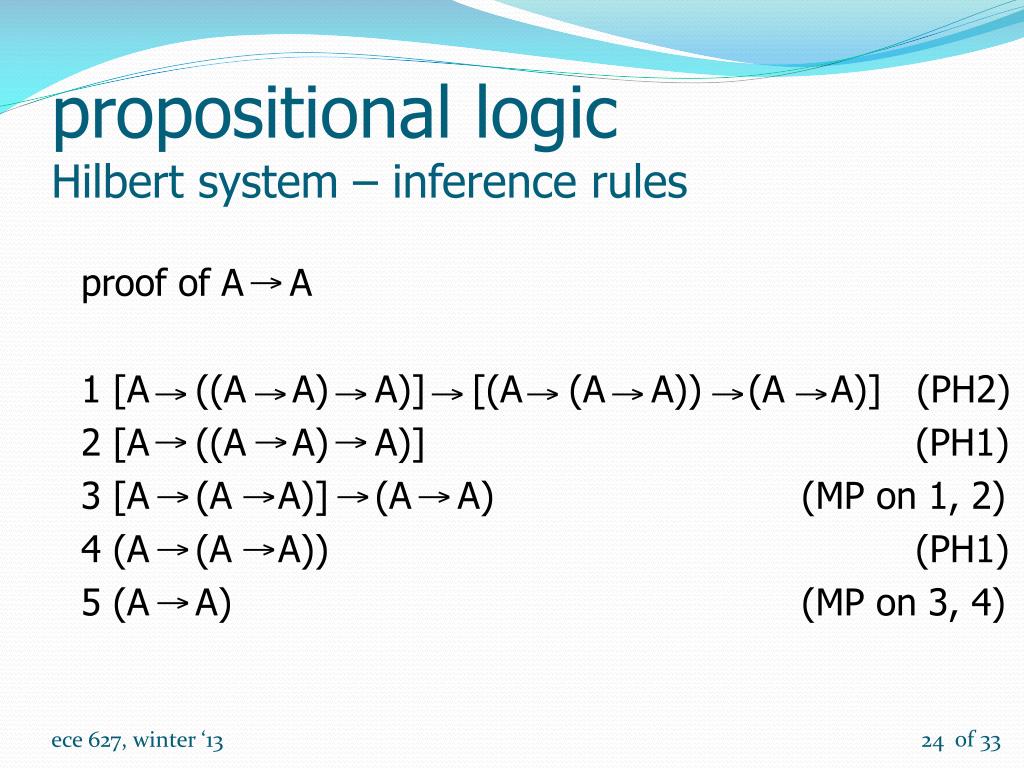 propositional logicHilbert system – inference rules proof of A A 1 [A ((A A) A)] [(A (A A)) (A A)] (PH2) 2 [A ((A A) A)] (PH1) 3 [A (A A)] (A A) (MP on 1, 2) 4 (A (A A)) (PH1) 5 (A A) (MP on 3, 4)
