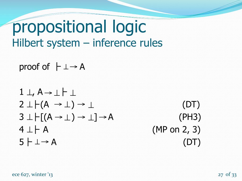 propositional logicHilbert system – inference rules proof of A 1 , A 2 (A ) (DT) 3 [(A ) ] A (PH3) 4 A (MP on 2, 3) 5 A (DT)