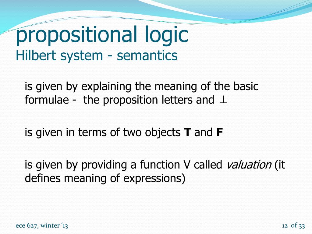propositional logicHilbert system - semantics is given by explaining the meaning of the basic formulae - the proposition letters and is given in terms of two objects T and F is given by providing a function V called valuation (it defines meaning of expressions)