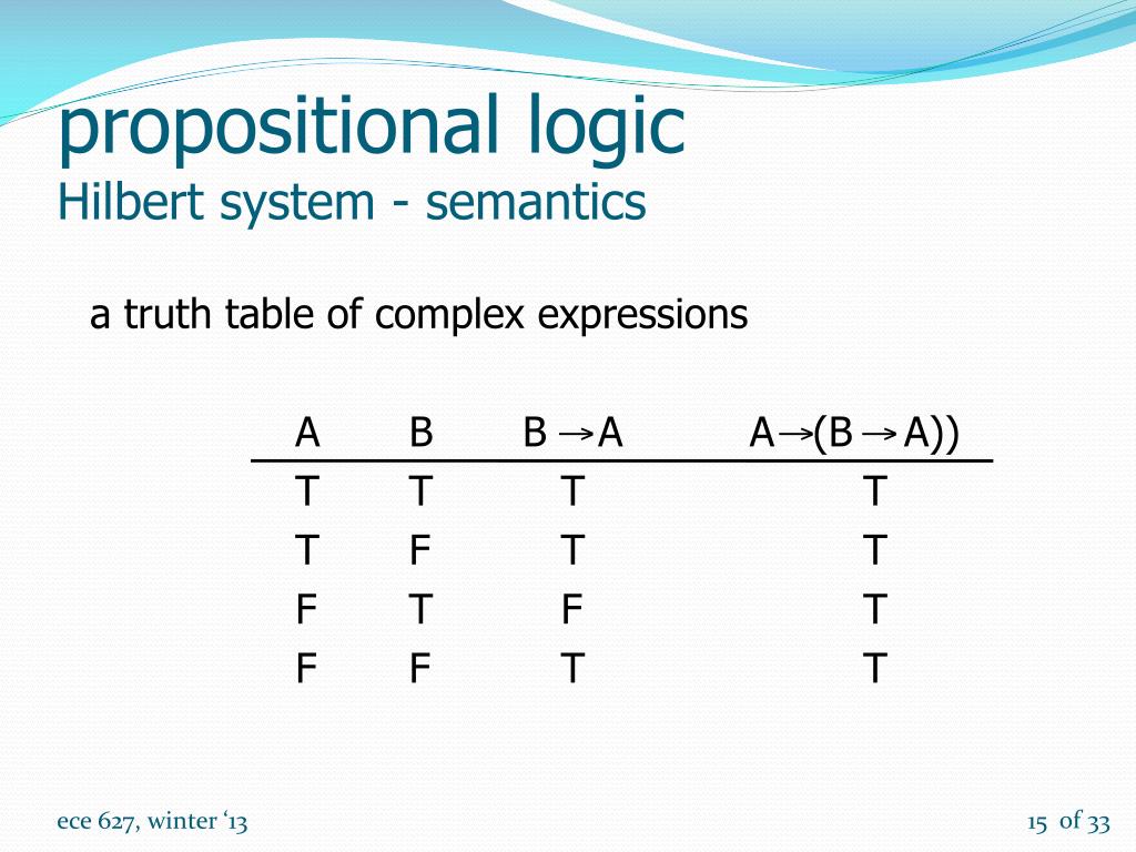 propositional logicHilbert system - semantics a truth table of complex expressions A B B A A (B A)) T T T T T F T T F T F T F F T T