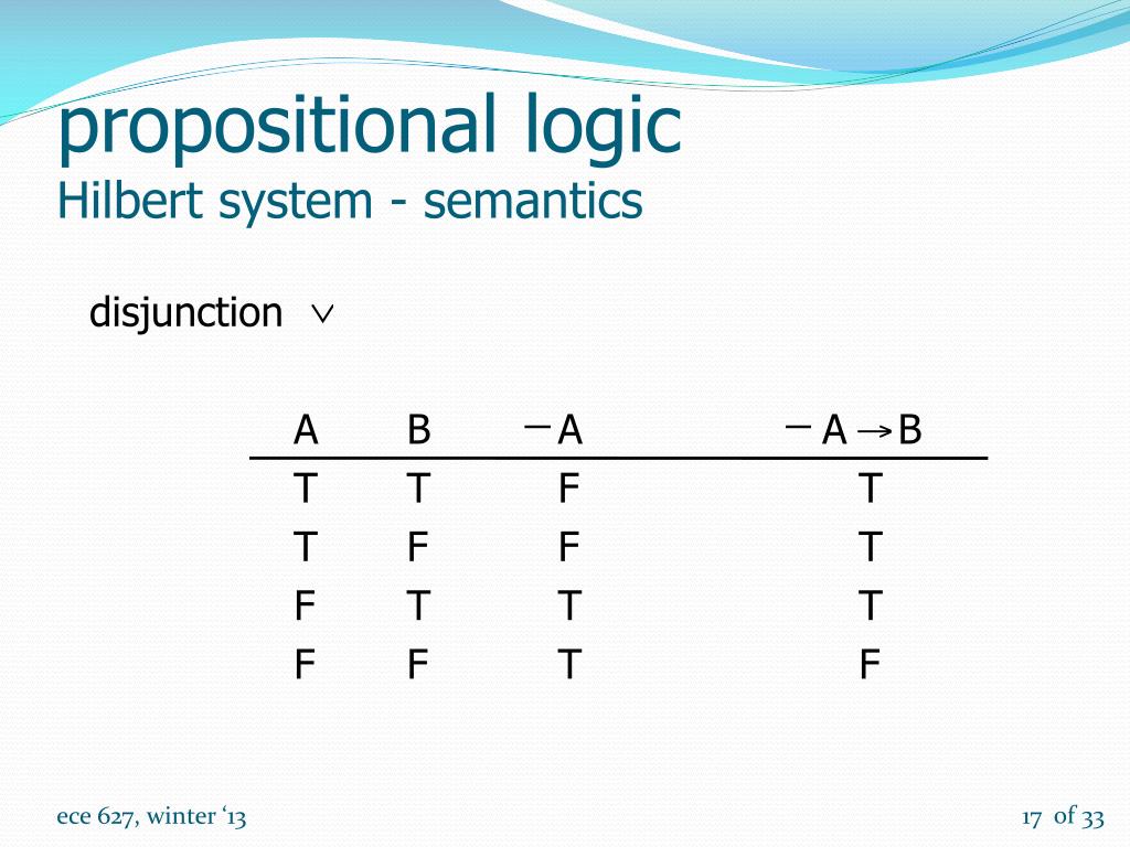 propositional logicHilbert system - semantics disjunction A B A A B T T F T T F F T F T T T F F T F