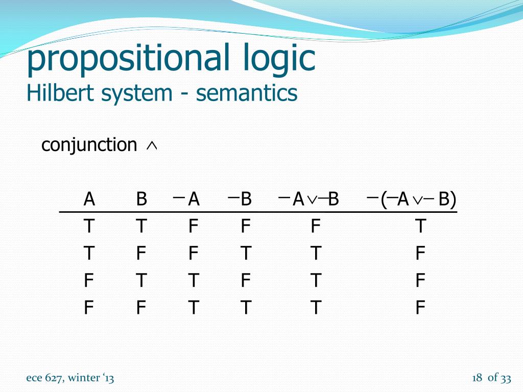 propositional logicHilbert system - semantics conjunction A B A B A B ( A B) T T F F F T T F F T T F F T T F T F F F T T T F