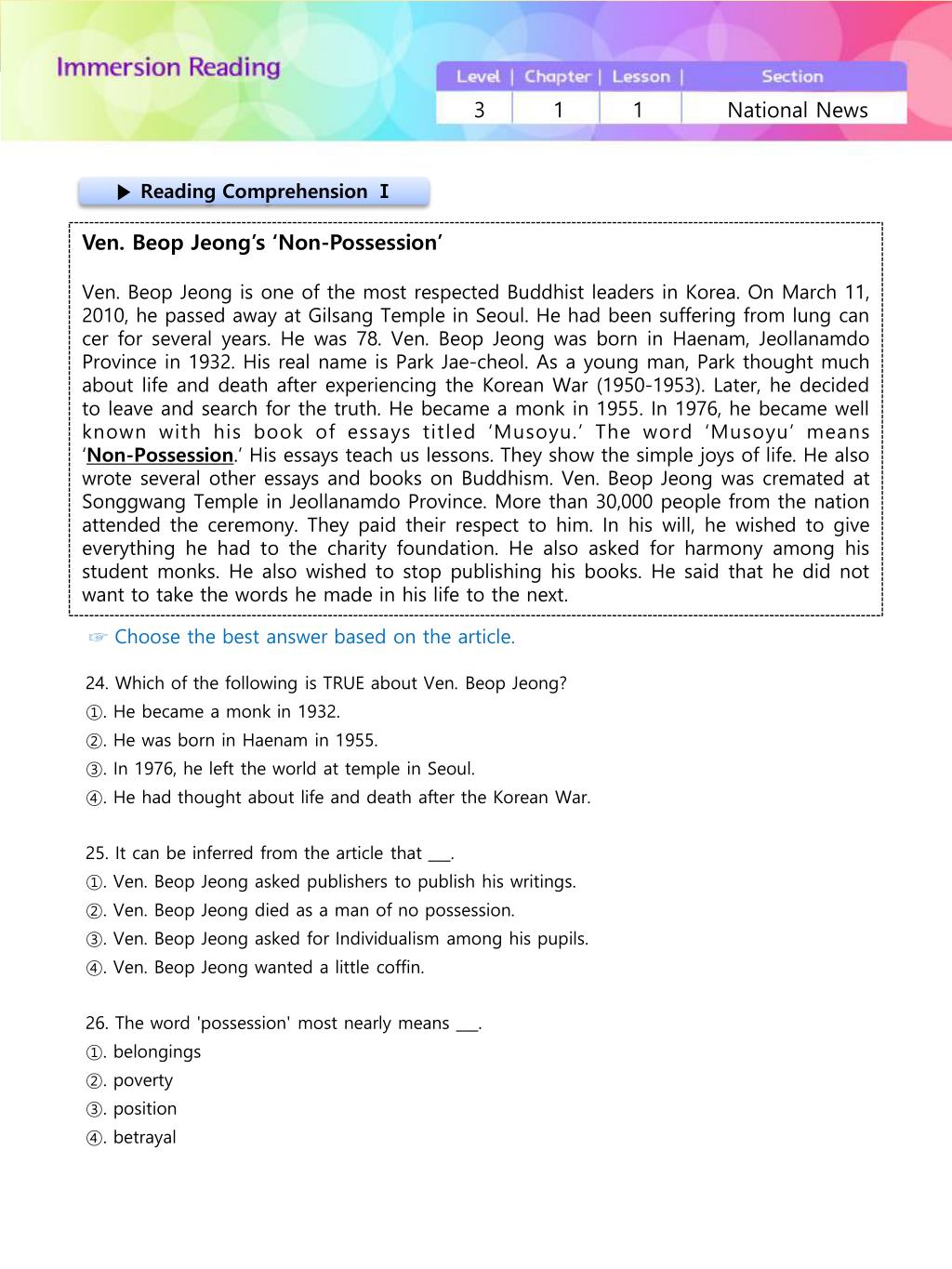 중급 Immersion Reading Course Worksheet 3 1 1 National News ▶Reading ComprehensionⅠ Ven. BeopJeong’s ‘Non-Possession’ Ven. BeopJeong is one of the most respected Buddhist leaders in Korea. On March 11, 2010, he passed away at Gilsang Temple in Seoul. He had been suffering from lung cancer for several years. He was 78. Ven. BeopJeong was born in Haenam, Jeollanamdo Province in 1932. His real name is Park Jae-cheol. As a young man, Park thought much about life and death after experiencing the Korean War (1950-1953). Later, he decided to leave and search for the truth. He became a monk in 1955. In 1976, he became well known with his book of essays titled ‘Musoyu.’ The word ‘Musoyu’ means ‘Non-Possession.’ His essays teach us lessons. They show the simple joys of life. He also wrote several other essays and books on Buddhism. Ven. BeopJeong was cremated at Songgwang Temple in Jeollanamdo Province. More than 30,000 people from the nation attended the ceremony. They paid their respect to him. In his will, he wished to give everything he had to the charity foundation. He also asked for harmony among his student monks. He also wished to stop publishing his books. He said that he did not want to take the words he made in his life to the next. ☞ Choose the best answer based on the article.