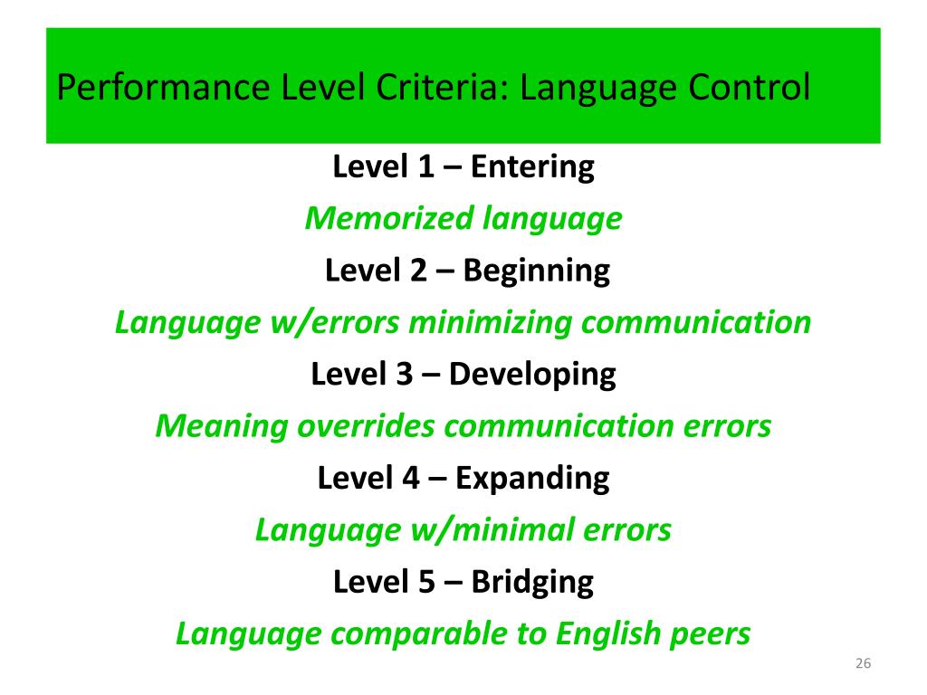 Performance Level Criteria: Language Control Level 1 – Entering Memorized language Level 2 – Beginning Language w/errors minimizing communication Level 3 – Developing Meaning overrides communication errors Level 4 – Expanding Language w/minimal errors Level 5 – Bridging Language comparable to English peers