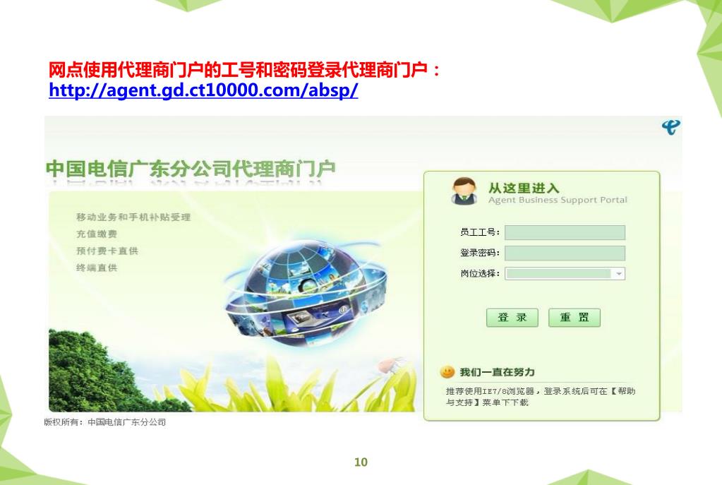 网点使用代理商门户的工号和密码登录代理商门户: http://agent.gd.ct10000.com/absp/ 10