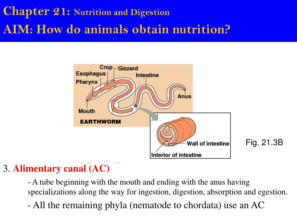 Chapter 21: Nutrition and Digestion AIM: How do animals obtain nutrition? 3. Alimentary canal (AC) Phylum: Annelida Fig. 21.3B 1. Substrate feeders taking in soil through the mouth 2. Soil enters pharynx (throat) and then passes down the esophagus to the crop. 3. The crop is an organ that moistens and stores food as the organism can eat soil quicker than it can digest and absorb the organic material.
