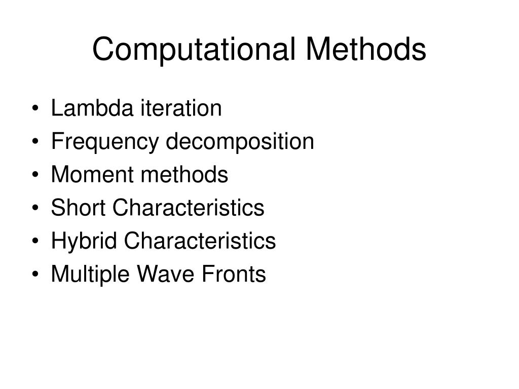 Computational Methods • Lambda iteration • Frequency decomposition • Moment methods • Short Characteristics • Hybrid Characteristics • Multiple Wave Fronts
