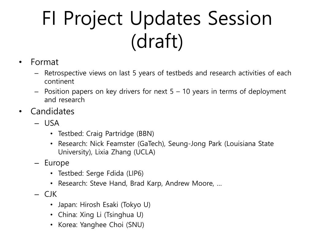 FI Project Updates Session (draft) • Format • Retrospective views on last 5 years of testbeds and research activities of each continent • Position papers on key drivers for next 5 – 10 years in terms of deployment and research • Candidates • USA • Testbed: Craig Partridge (BBN) • Research: Nick Feamster (GaTech), Seung-Jong Park (Louisiana State University), Lixia Zhang (UCLA) • Europe • Testbed: Serge Fdida (LIP6) • Research: Steve Hand, Brad Karp, Andrew Moore, … • CJK • Japan: Hirosh Esaki (Tokyo U) • China: Xing Li (Tsinghua U) • Korea: Yanghee Choi (SNU)