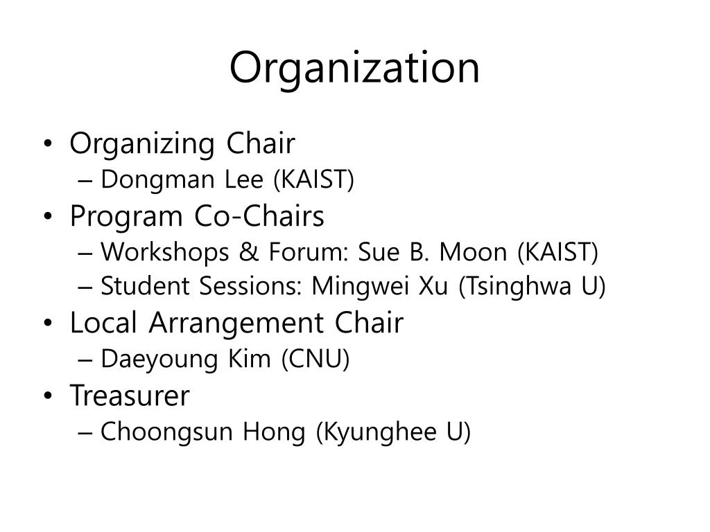 Organization • Organizing Chair • Dongman Lee (KAIST) • Program Co-Chairs • Workshops & Forum: Sue B. Moon (KAIST) • Student Sessions: MingweiXu (Tsinghwa U) • Local Arrangement Chair • Daeyoung Kim (CNU) • Treasurer • Choongsun Hong (Kyunghee U)
