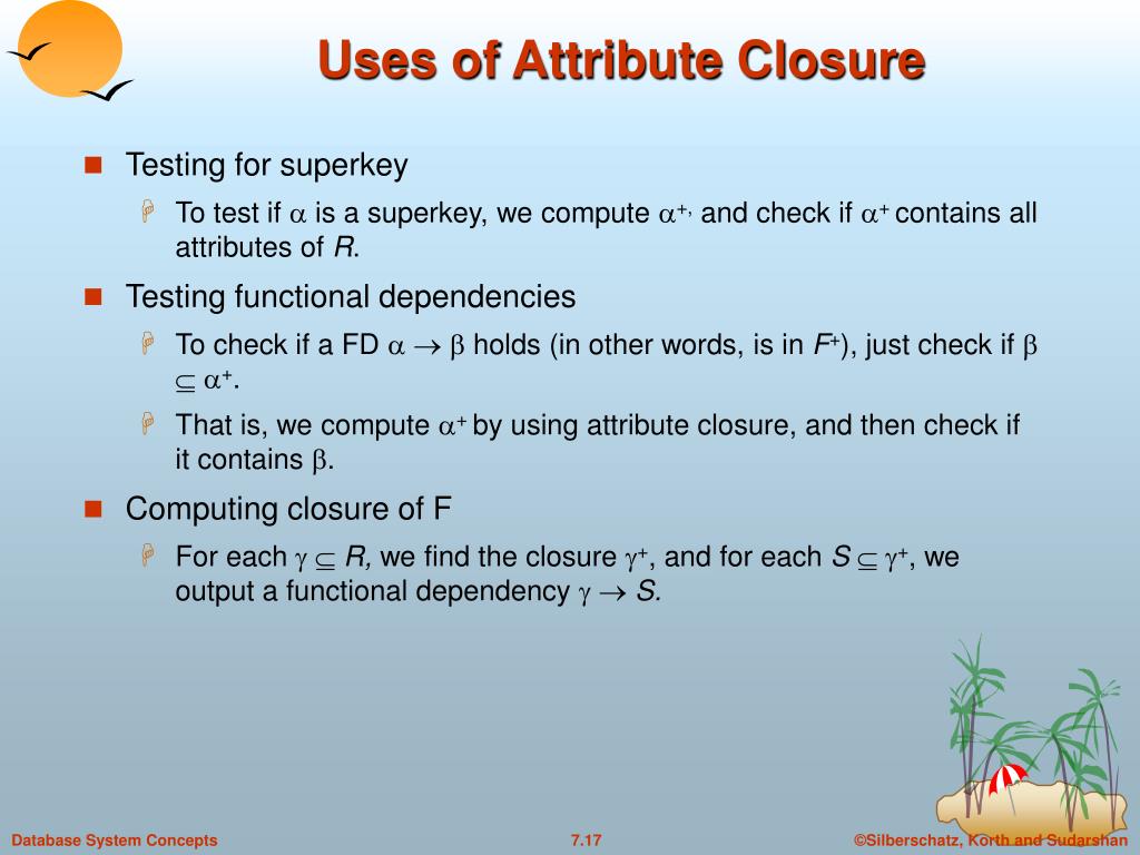 Testing for superkey To test if is a superkey, we compute +, and check if + contains all attributes of R. Testing functional dependencies To check if a FD holds (in other words, is in F+), just check if +. That is, we compute + by using attribute closure, and then check if it contains . Computing closure of F For each R, we find the closure +, and for each S +, we output a functional dependency S. Uses of Attribute Closure