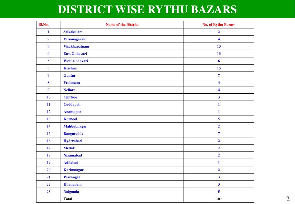CONCEPT • The Rythu Bazars were established in the year 1999. The concept of Rythu Bazar was developed to facilitate direct marketing between consumers and farmers. • Rythu Bazars are planned for direct interface between the farmers and the consumers eliminating middlemen. Rythu Bazars will operate outside the purview of Markets Act 1966. • Rythu Bazars are located on Government land convenient to both the farmers and consumers. Across the state 107 Rythu Bazars are functioning in Andhra Pradesh. • Besides above 14 mobile RythuBazars and two outlets in twin cities are working. RythuBazars are exempted from payment of market fees, service charges on the farmers and users respectively. 7 more Rythubazars are also working • Prices of the vegetable are fixed through a committee of farmers and the departmental officer. The prices of vegetable of RythuBazars are generally 25% above the wholesale prices and 25% less than the local retail price, thus reducing the gap between farm gate prices and retail price. 1