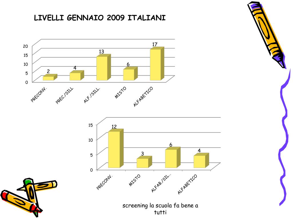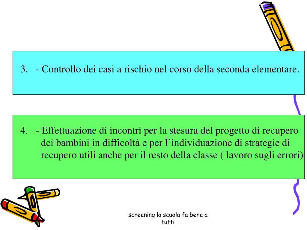 - Controllo dei casi a rischio nel corso della seconda elementare. • - Effettuazione di incontri per la stesura del progetto di recupero • dei bambini in difficoltà e per l’individuazione di strategie di • recupero utili anche per il resto della classe ( lavoro sugli errori) screening la scuola fa bene a tutti