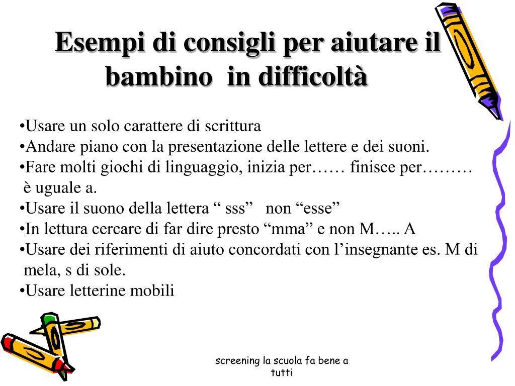 Esempi di consigli per aiutare il bambino in difficoltà • Usare un solo carattere di scrittura • Andare piano con la presentazione delle lettere e dei suoni. • Fare molti giochi di linguaggio, inizia per…… finisce per……… • è uguale a. • Usare il suono della lettera “ sss” non “esse” • In lettura cercare di far dire presto “mma” e non M….. A • Usare dei riferimenti di aiuto concordati con l’insegnante es. M di • mela, s di sole. • Usare letterine mobili screening la scuola fa bene a tutti