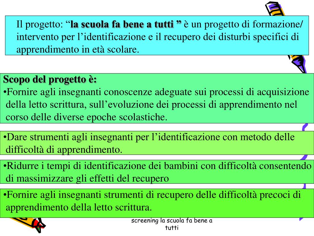Il progetto: “la scuola fa bene a tutti ” è un progetto di formazione/ intervento per l’identificazione e il recupero dei disturbi specifici di apprendimento in età scolare. • Scopo del progetto è: • Fornire agli insegnanti conoscenze adeguate sui processi di acquisizione • della letto scrittura, sull’evoluzione dei processi di apprendimento nel • corso delle diverse epoche scolastiche. • Dare strumenti agli insegnanti per l’identificazione con metodo delle • difficoltà di apprendimento. • Ridurre i tempi di identificazione dei bambini con difficoltà consentendo • di massimizzare gli effetti del recupero • Fornire agli insegnanti strumenti di recupero delle difficoltà precoci di • apprendimento della letto scrittura. screening la scuola fa bene a tutti