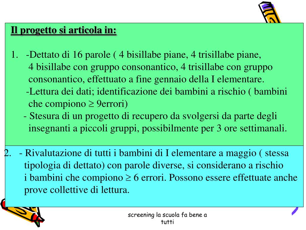 Il progetto si articola in: • -Dettato di 16 parole ( 4 bisillabe piane, 4 trisillabe piane, • 4 bisillabe con gruppo consonantico, 4 trisillabe con gruppo • consonantico, effettuato a fine gennaio della I elementare. • -Lettura dei dati; identificazione dei bambini a rischio ( bambini • che compiono 9errori) • - Stesura di un progetto di recupero da svolgersi da parte degli • insegnanti a piccoli gruppi, possibilmente per 3 ore settimanali. • - Rivalutazione di tutti i bambini di I elementare a maggio ( stessa • tipologia di dettato) con parole diverse, si considerano a rischio • i bambini che compiono 6 errori. Possono essere effettuate anche • prove collettive di lettura. screening la scuola fa bene a tutti