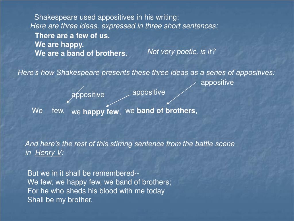 appositive few, we happy few, appositive appositive we band of brothers, Shakespeare used appositives in his writing: Here are three ideas, expressed in three short sentences: There are a few of us. We are happy. We are a band of brothers. Not very poetic, is it? Here’s how Shakespeare presents these three ideas as a series of appositives: We And here’s the rest of this stirring sentence from the battle scene in Henry V: But we in it shall be remembered-- We few, we happy few, we band of brothers; For he who sheds his blood with me today Shall be my brother.