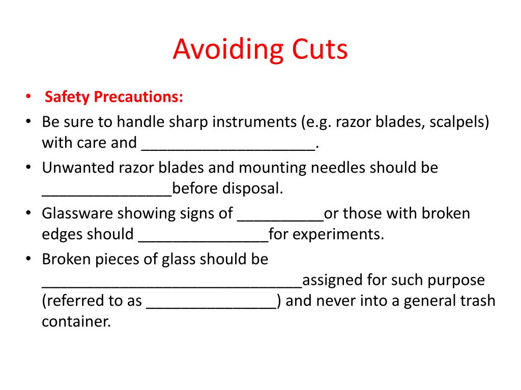 Avoiding Cuts • Safety Precautions: • Be sure to handle sharp instruments (e.g. razor blades, scalpels) with care and ____________________. • Unwanted razor blades and mounting needles should be _______________before disposal. • Glassware showing signs of __________or those with broken edges should _______________for experiments. • Broken pieces of glass should be ______________________________assigned for such purpose (referred to as _______________) and never into a general trash container.