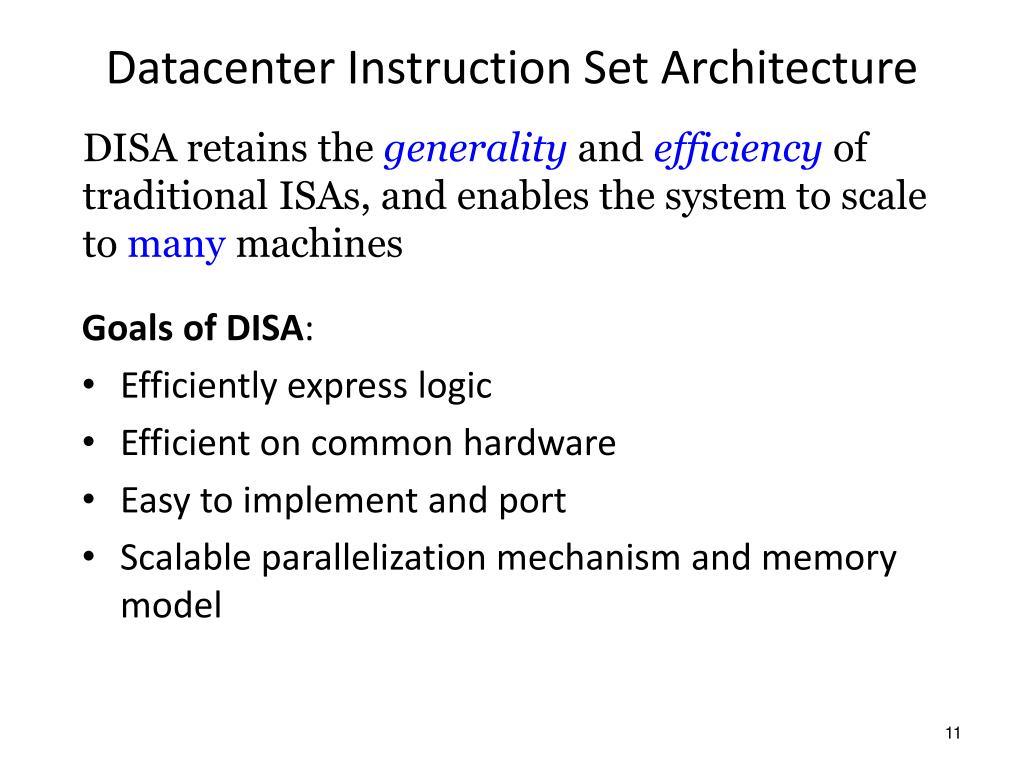 Datacenter Instruction Set Architecture DISA retains the generalityand efficiencyof traditional ISAs, and enables the system to scale to manymachines Goals of DISA: • Efficiently express logic • Efficient on common hardware • Easy to implement and port • Scalable parallelization mechanism and memory model