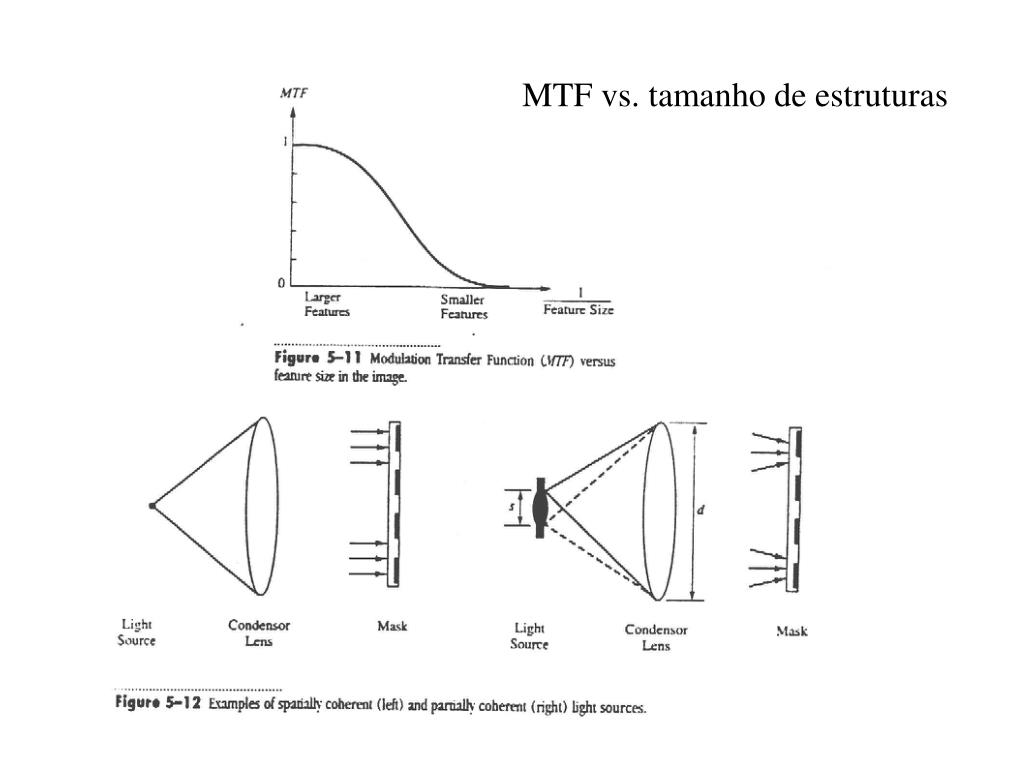 MTF crítica: característica de fororresiste (MTF mínima necessária para resolver a estrutura no resiste) MTF crítica : CMTF=(Qf -Qo)/(Qf +Qo) CMTF ~ 0.4 para g e i linhas. Para DUV resistes (contaste maior) , CMTF ~ 0.1-0.2