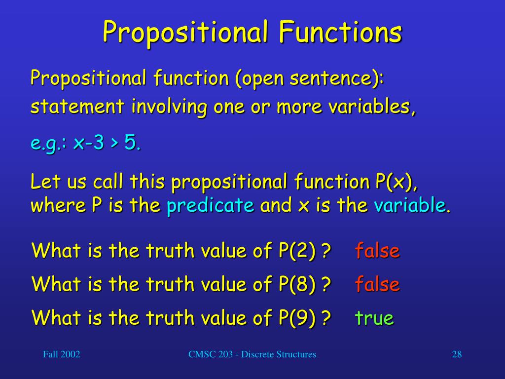 Propositional Functions • Let us consider the propositional function Q(x, y, z) defined as: • x + y = z. • Here, Q is the predicate and x, y, and z are the variables. What is the truth value of Q(2, 3, 5) ? true What is the truth value of Q(0, 1, 2) ? false What is the truth value of Q(9, -9, 0) ? true CMSC 203 - Discrete Structures