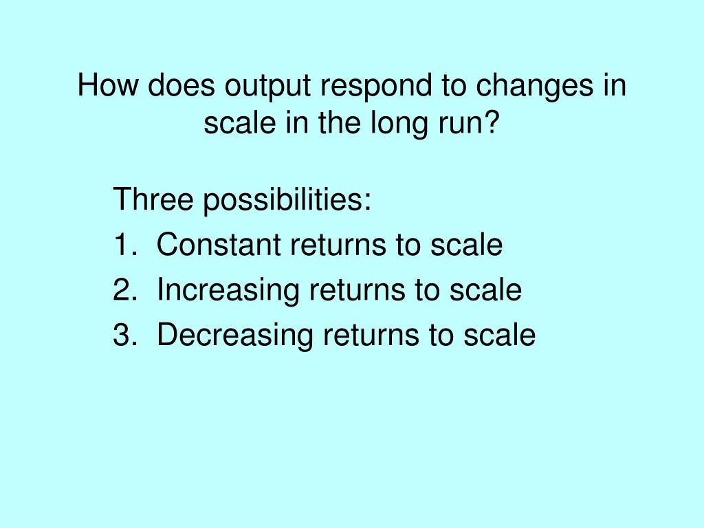 How does output respond to changes in scale in the long run? • Three possibilities: • 1. Constant returns to scale • 2. Increasing returns to scale • 3. Decreasing returns to scale
