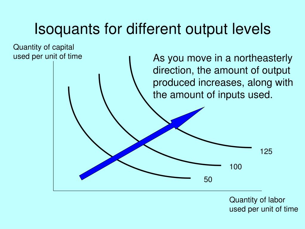Isoquants for different output levels Quantity of capital used per unit of time As you move in a northeasterly direction, the amount of output produced increases, along with the amount of inputs used. 125 100 50 Quantity of labor used per unit of time