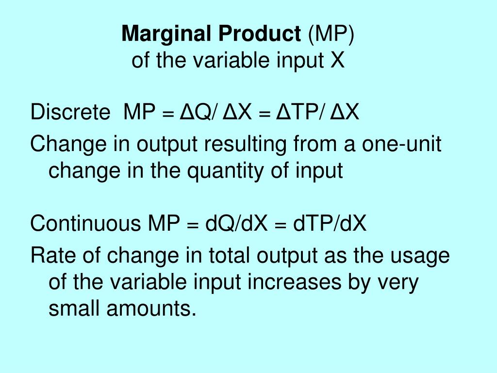Marginal Product (MP) of the variable input X • Discrete MP = ΔQ/ ΔX = ΔTP/ ΔX • Change in output resulting from a one-unit change in the quantity of input • Continuous MP = dQ/dX = dTP/dX • Rate of change in total output as the usage of the variable input increases by very small amounts.