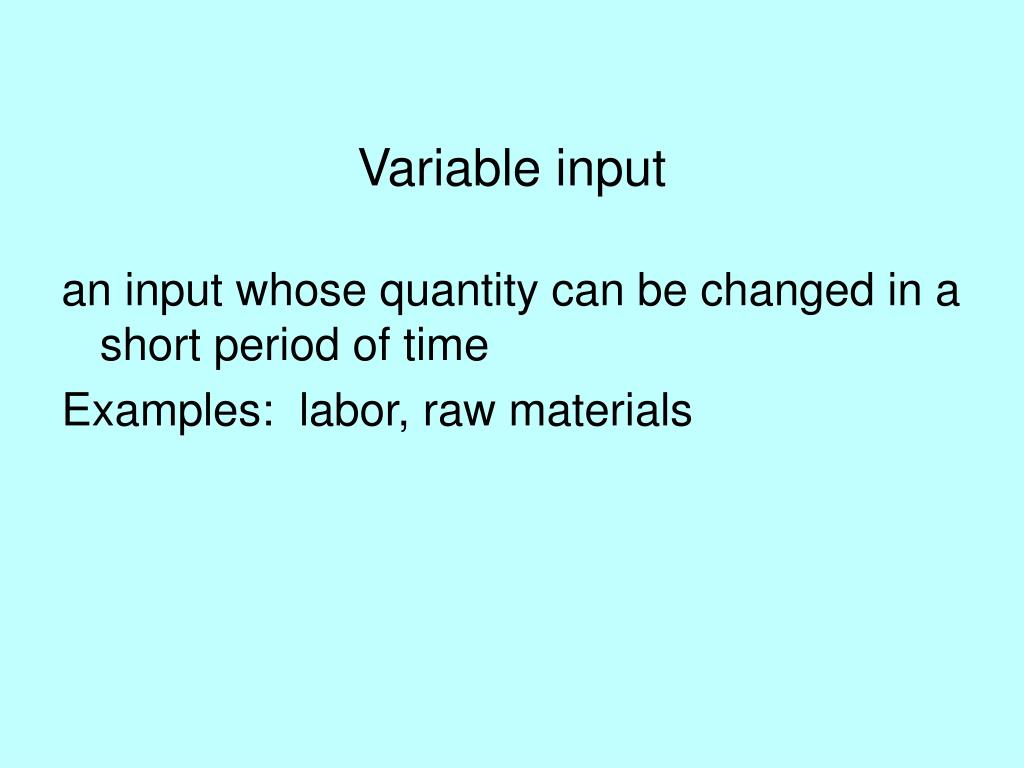 Variable input • an input whose quantity can be changed in a short period of time • Examples: labor, raw materials