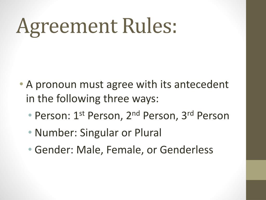 Agreement Rules: • A pronoun must agree with its antecedent in the following three ways: • Person: 1stPerson, 2nd Person, 3rd Person • Number: Singular or Plural • Gender: Male, Female, or Genderless