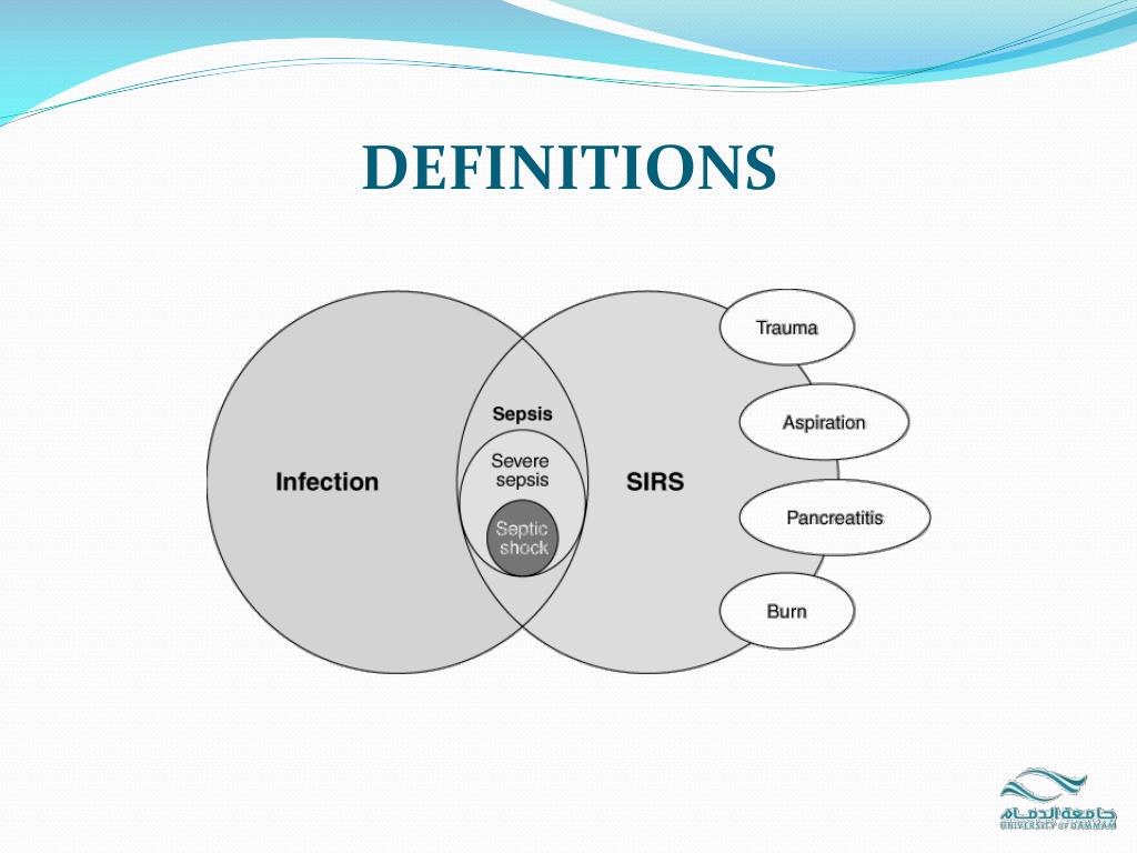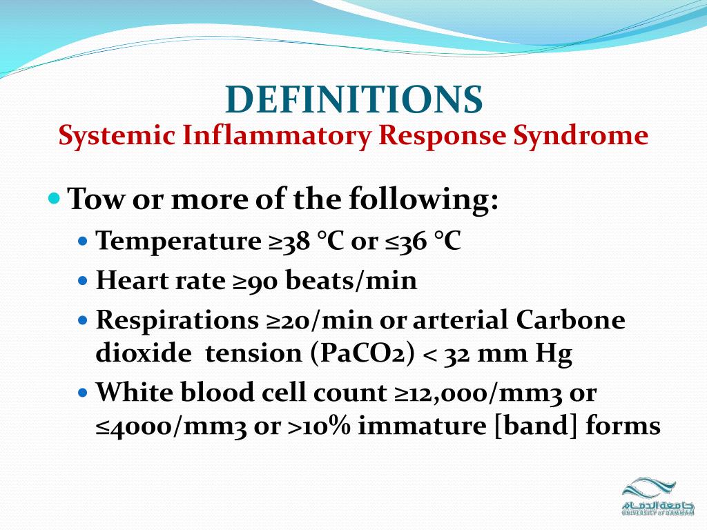 DEFINITIONS Systemic Inflammatory Response Syndrome • Tow or more of the following: • Temperature ≥38 °C or ≤36 °C • Heart rate ≥90 beats/min • Respirations ≥20/min or arterial Carbone dioxide tension (PaCO2) < 32 mm Hg • White blood cell count ≥12,000/mm3 or ≤4000/mm3 or >10% immature [band] forms