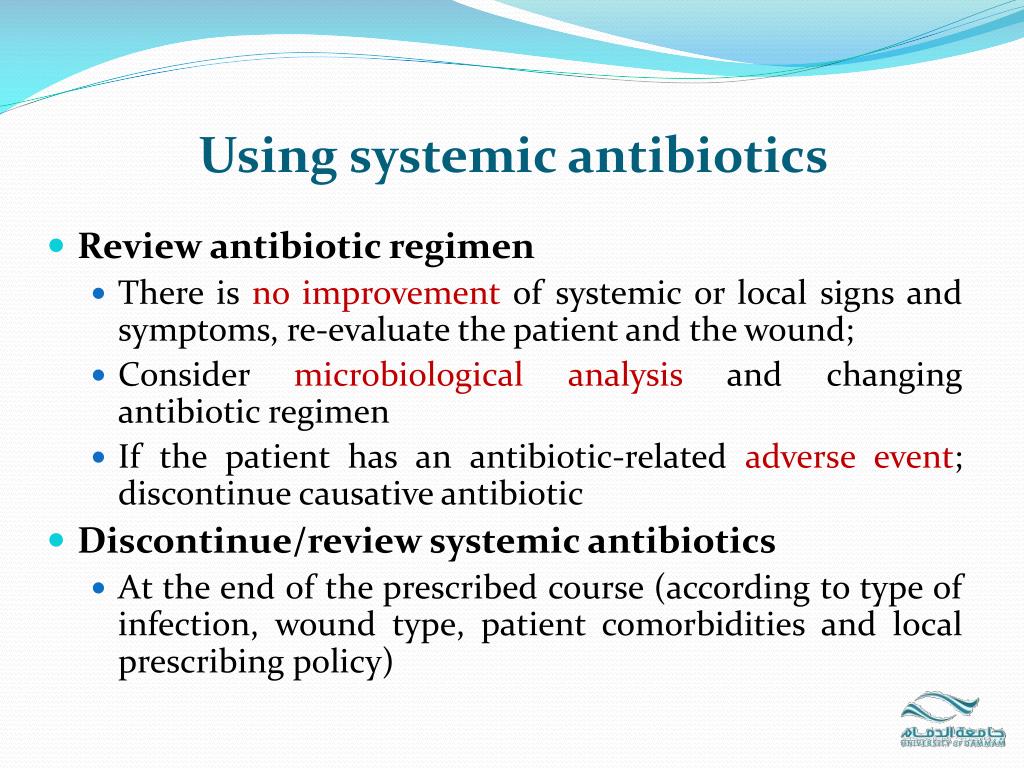Using systemic antibiotics • Review antibiotic regimen • There is no improvement of systemic or local signs and symptoms, re-evaluate the patient and the wound; • Consider microbiological analysis and changing antibiotic regimen • If the patient has an antibiotic-related adverse event; discontinue causative antibiotic • Discontinue/review systemic antibiotics • At the end of the prescribed course (according to type of infection, wound type, patient comorbidities and local prescribing policy)