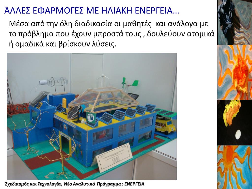 ΆΛΛΕΣ ΕΦΑΡΜΟΓΕΣ ΜΕ ΗΛΙΑΚΗ ΕΝΕΡΓΕΙΑ… Μέσα από την όλη διαδικασία οι μαθητές και ανάλογα με το πρόβλημα που έχουν μπροστά τους , δουλεύουν ατομικά ή ομαδικά και βρίσκουν λύσεις. Σχεδιασμός και Τεχνολογία, Νέο Αναλυτικό Πρόγραμμα : ΕΝΕΡΓΕΙΑ