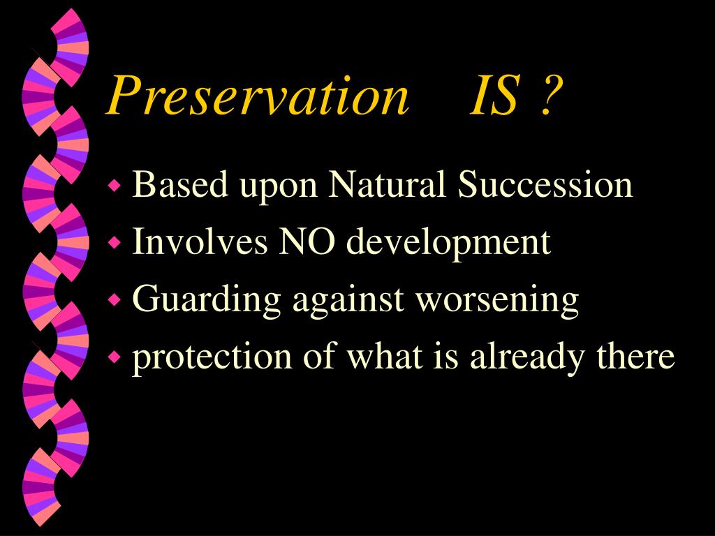 Preservation IS ? • Based upon Natural Succession • Involves NO development • Guarding against worsening • protection of what is already there