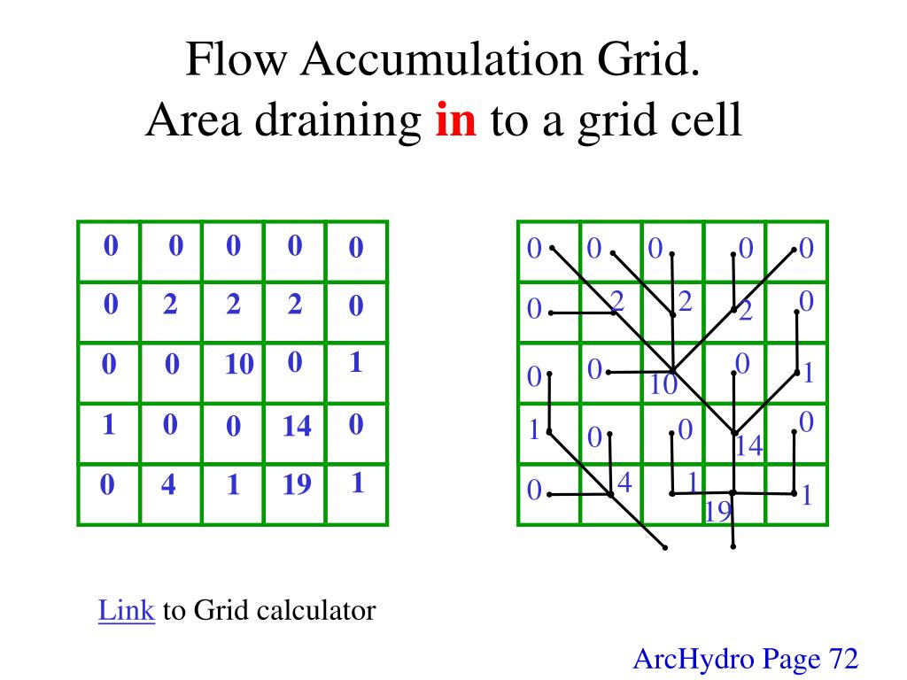 Flow Accumulation Grid. Area draining in to a grid cell 0 0 0 0 0 0 0 0 0 0 0 2 2 2 0 2 2 0 0 2 0 1 0 0 10 0 0 1 0 10 1 0 0 0 14 0 1 0 0 14 1 0 4 1 19 4 1 0 1 19 Link to Grid calculator ArcHydro Page 72