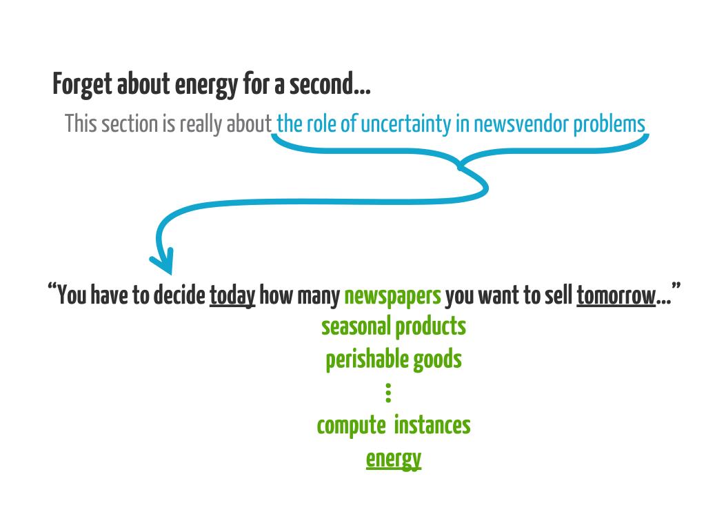 Forget about energy for a second… This section is really about the role of uncertainty in newsvendor problems “You have to decide today how many newspapers you want to sell tomorrow…” seasonal products perishablegoods compute instances energy …