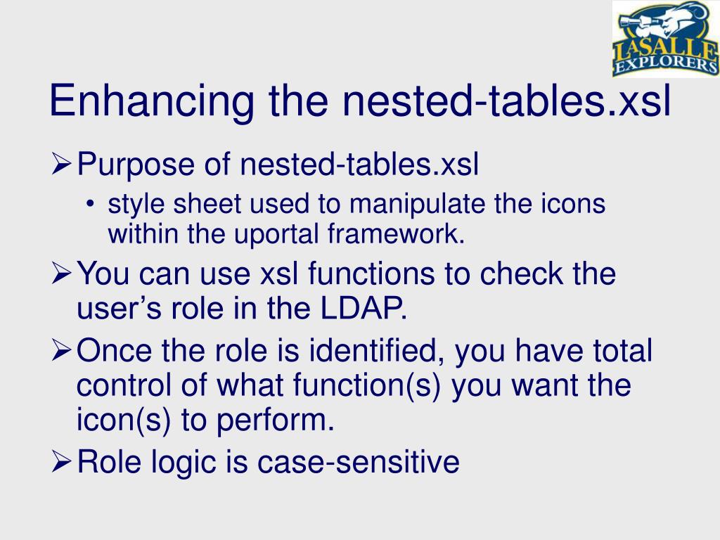 Enhancing the nested-tables.xsl • Purpose of nested-tables.xsl • style sheet used to manipulate the icons within the uportal framework. • You can use xsl functions to check the user’s role in the LDAP. • Once the role is identified, you have total control of what function(s) you want the icon(s) to perform. • Role logic is case-sensitive