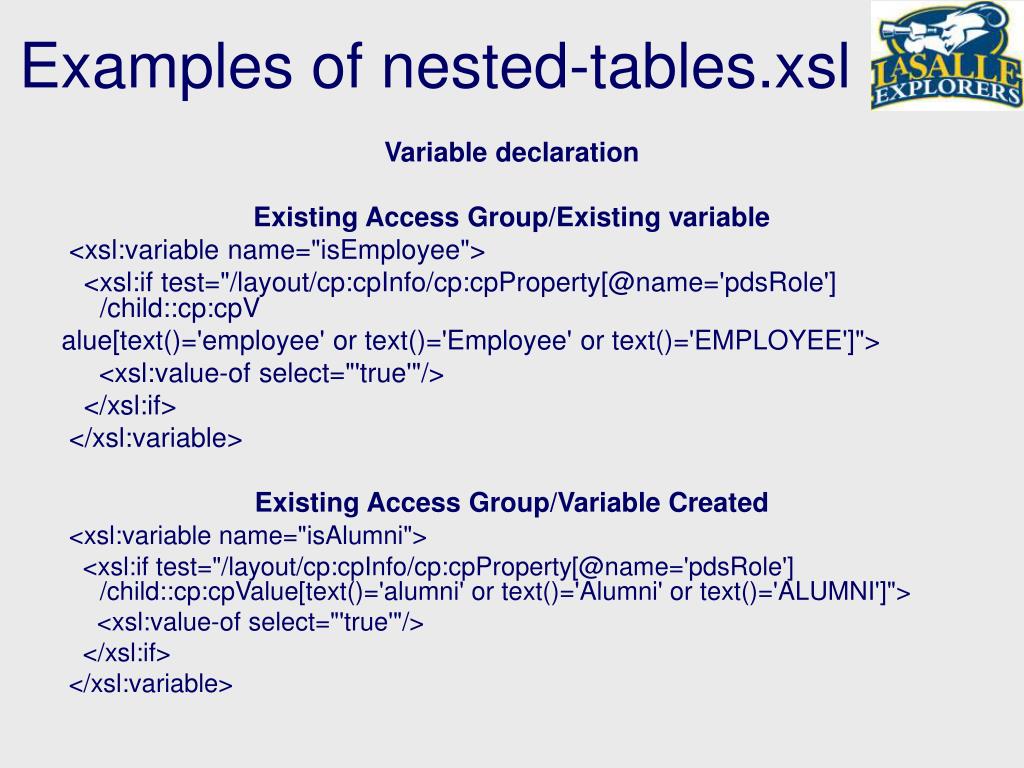 Examples of nested-tables.xsl Variable declaration Existing Access Group/Existing variable <xsl:variable name="isEmployee"> <xsl:if test="/layout/cp:cpInfo/cp:cpProperty[@name='pdsRole'] /child::cp:cpV alue[text()='employee' or text()='Employee' or text()='EMPLOYEE']"> <xsl:value-of select="'true'"/> </xsl:if> </xsl:variable> Existing Access Group/Variable Created <xsl:variable name="isAlumni"> <xsl:if test="/layout/cp:cpInfo/cp:cpProperty[@name='pdsRole'] /child::cp:cpValue[text()='alumni' or text()='Alumni' or text()='ALUMNI']"> <xsl:value-of select="'true'"/> </xsl:if> </xsl:variable>