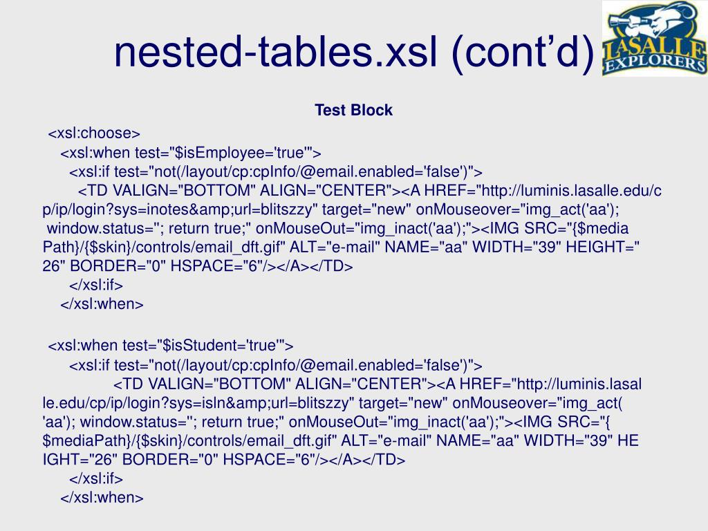 nested-tables.xsl (cont’d) Test Block <xsl:choose> <xsl:when test="$isEmployee='true'"> <xsl:if test="not(/layout/cp:cpInfo/@email.enabled='false')"> <TD VALIGN="BOTTOM" ALIGN="CENTER"><A HREF="http://luminis.lasalle.edu/c p/ip/login?sys=inotes&url=blitszzy" target="new" onMouseover="img_act('aa'); window.status=''; return true;" onMouseOut="img_inact('aa');"><IMG SRC="{$media Path}/{$skin}/controls/email_dft.gif" ALT="e-mail" NAME="aa" WIDTH="39" HEIGHT=" 26" BORDER="0" HSPACE="6"/></A></TD> </xsl:if> </xsl:when> <xsl:when test="$isStudent='true'"> <xsl:if test="not(/layout/cp:cpInfo/@email.enabled='false')"> <TD VALIGN="BOTTOM" ALIGN="CENTER"><A HREF="http://luminis.lasal le.edu/cp/ip/login?sys=isln&url=blitszzy" target="new" onMouseover="img_act( 'aa'); window.status=''; return true;" onMouseOut="img_inact('aa');"><IMG SRC="{ $mediaPath}/{$skin}/controls/email_dft.gif" ALT="e-mail" NAME="aa" WIDTH="39" HE IGHT="26" BORDER="0" HSPACE="6"/></A></TD> </xsl:if> </xsl:when>