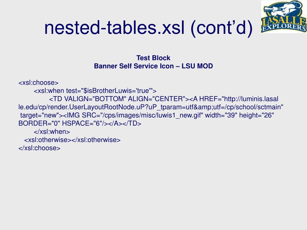 nested-tables.xsl (cont’d) Test Block Banner Self Service Icon – LSU MOD <xsl:choose> <xsl:when test="$isBrotherLuwis='true'"> <TD VALIGN="BOTTOM" ALIGN="CENTER"><A HREF="http://luminis.lasal le.edu/cp/render.UserLayoutRootNode.uP?uP_tparam=utf&utf=/cp/school/sctmain" target="new"><IMG SRC="/cps/images/misc/luwis1_new.gif" width="39" height="26" BORDER="0" HSPACE="6"/></A></TD> </xsl:when> <xsl:otherwise></xsl:otherwise> </xsl:choose>