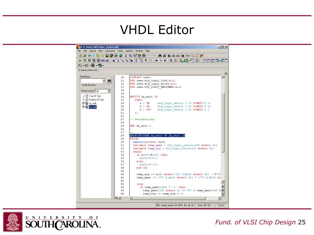 HDL Designer • Allows for rapid VHDL development • graphical design entry • generated VHDL • automated design flows • Views • Block diagram • State machine • Truth table • Flow chart • VHDL view (combined or architecture-only) • Symbol