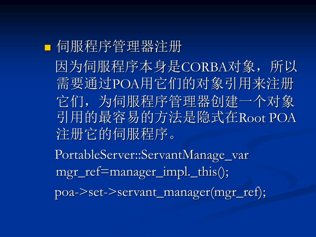 伺服程序管理器注册 因为伺服程序本身是CORBA对象,所以需要通过POA用它们的对象引用来注册它们,为伺服程序管理器创建一个对象引用的最容易的方法是隐式在Root POA注册它的伺服程序。 PortableServer::ServantManage_var mgr_ref=manager_impl._this(); poa->set->servant_manager(mgr_ref);