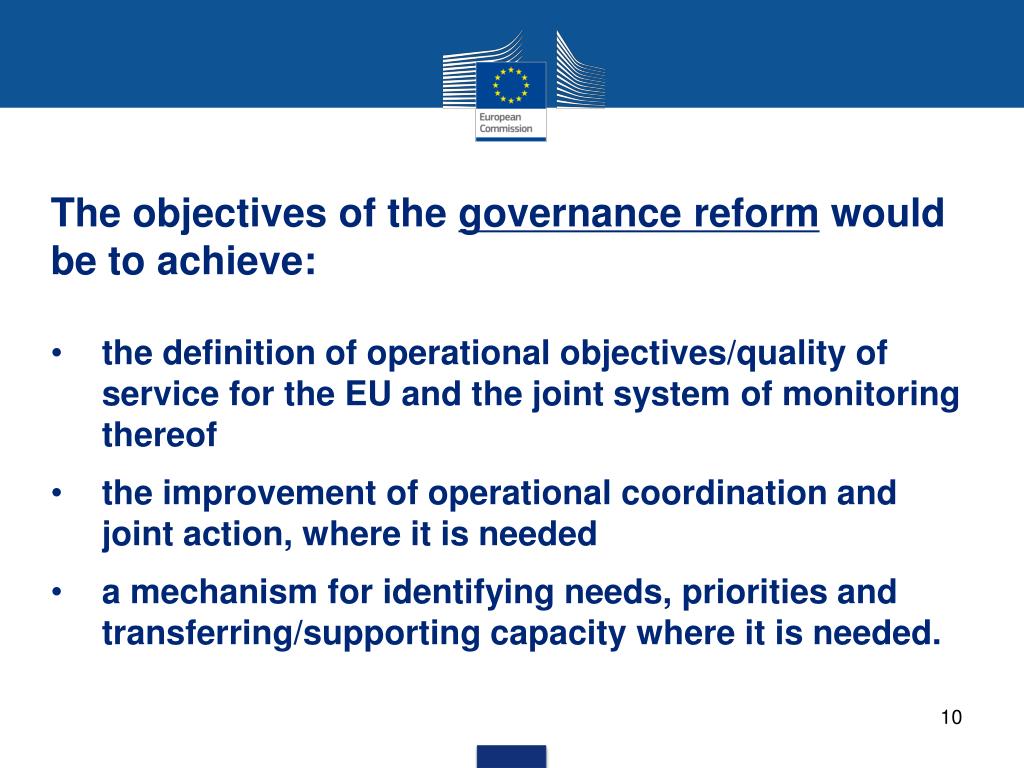 The objectives of the governancereformwouldbe to achieve: • the definition of operational objectives/quality of service for the EU and the joint system of monitoring thereof • the improvement of operational coordination and joint action, whereitisneeded • a mechanism for identifyingneeds, priorities and transferring/supportingcapacitywhereitisneeded.