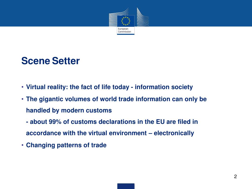 SceneSetter • Virtual reality: the fact of life today - information society • The gigantic volumes of world trade information canonlybehandled by modern customs - about 99% of customs declarations in the EU are filed in accordance with the virtualenvironment – electronically • Changing patterns of trade