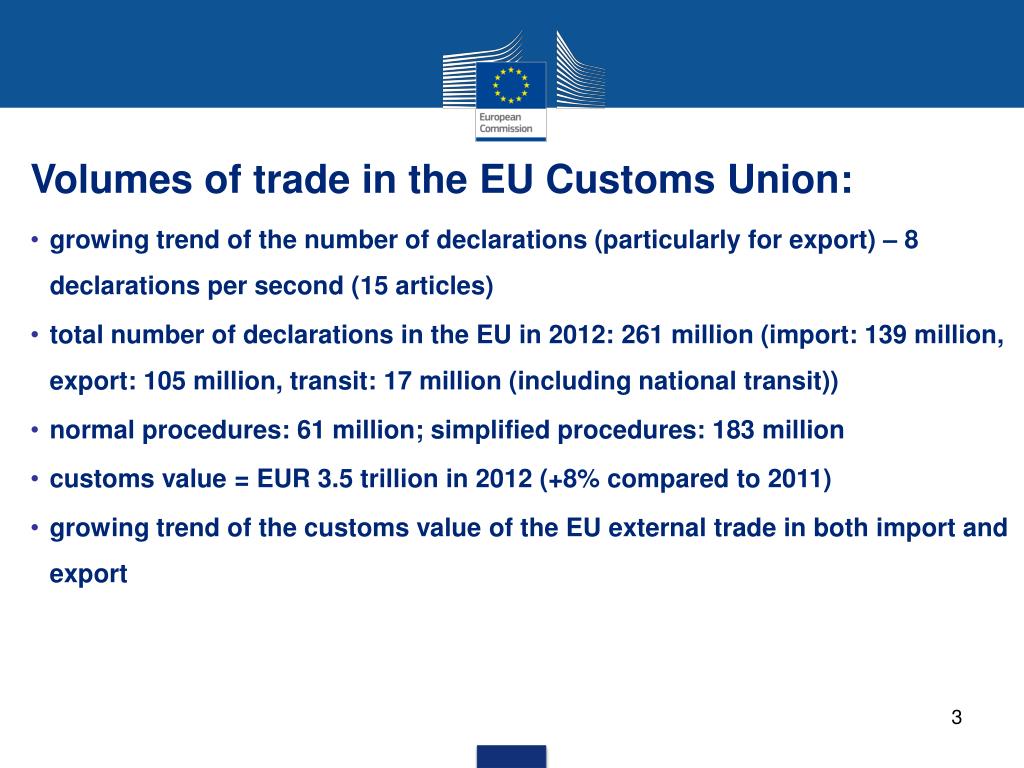 Volumes of trade in the EU Customs Union: • growing trend of the number of declarations (particularly for export) – 8 declarations per second (15 articles) • total number of declarations in the EU in 2012: 261 million (import: 139 million, export: 105 million, transit: 17 million (including national transit)) • normal procedures: 61 million; simplifiedprocedures: 183 million • customs value = EUR 3.5 trillion in 2012 (+8% compared to 2011) • growing trend of the customs value of the EU externaltrade in both import and export