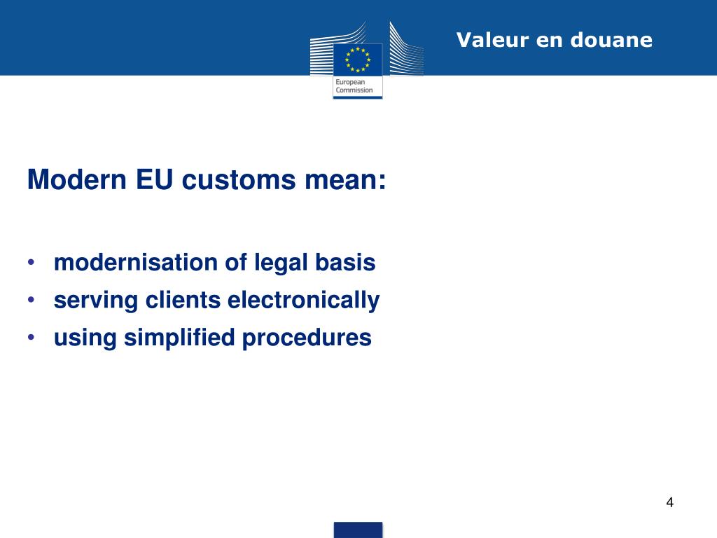 Valeur en douane Modern EU customs mean: • modernisation of legal basis • serving clients electronically • usingsimplifiedprocedures