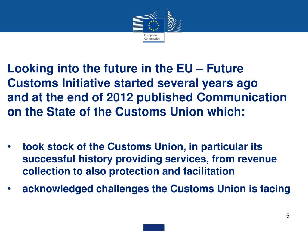 Lookinginto the future in the EU – Future Customs Initiative startedseveralyearsago • and at the end of 2012 published Communication on the State of the Customs Union which: • took stock of the Customs Union, in particularitssuccessfulhistoryproviding services, from revenue collection to also protection and facilitation • acknowledged challenges the Customs Union isfacing