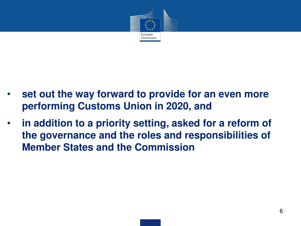 set out the wayforward to provide for an even more performing Customs Union in 2020, and • in addition to a priority setting, asked for a reform of the governance and the roles and responsibilities of Member States and the Commission