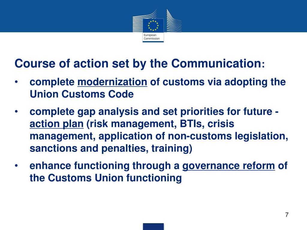 Course of action set by the Communication: • completemodernization of customs via adopting the Union Customs Code • complete gap analysis and set priorities for future - action plan (risk management, BTIs, crisis management, application of non-customs legislation, sanctions and penalties, training) • enhancefunctioningthrough a governancereform of the Customs Union functioning