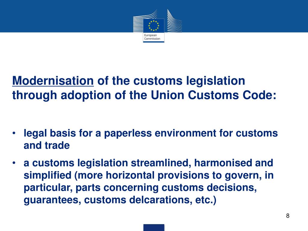 Modernisation of the customs legislationthrough adoption of the Union Customs Code: • legal basis for a paperlessenvironment for customs and trade • a customs legislationstreamlined, harmonised and simplified (more horizontal provisions to govern, in particular, parts concerning customs decisions, guarantees, customs delcarations, etc.)