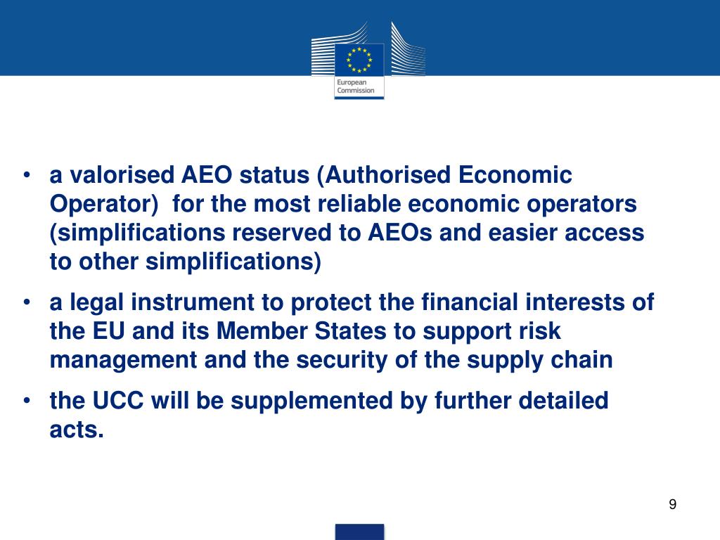 a valorised AEO status (AuthorisedEconomicOperator) for the mostreliableeconomicoperators (simplifications reserved to AEOs and easieraccess to other simplifications) • a legal instrument to protect the financialinterests of the EU and itsMember States to support risk management and the security of the supplychain • the UCC willbesupplemented by furtherdetailedacts.